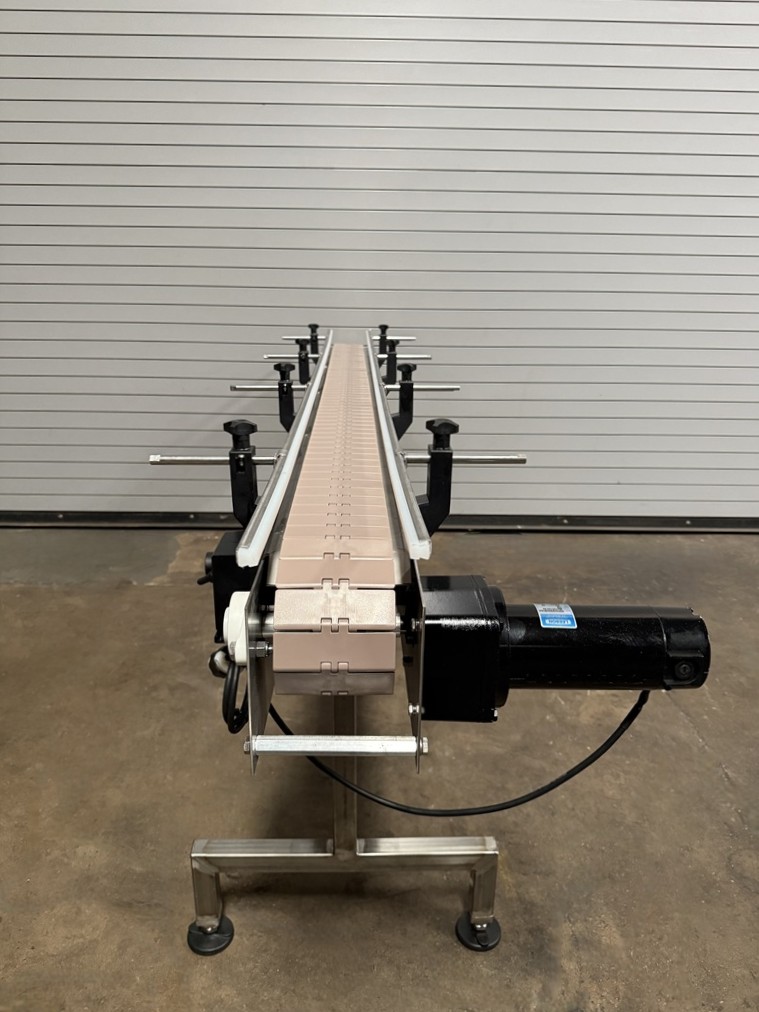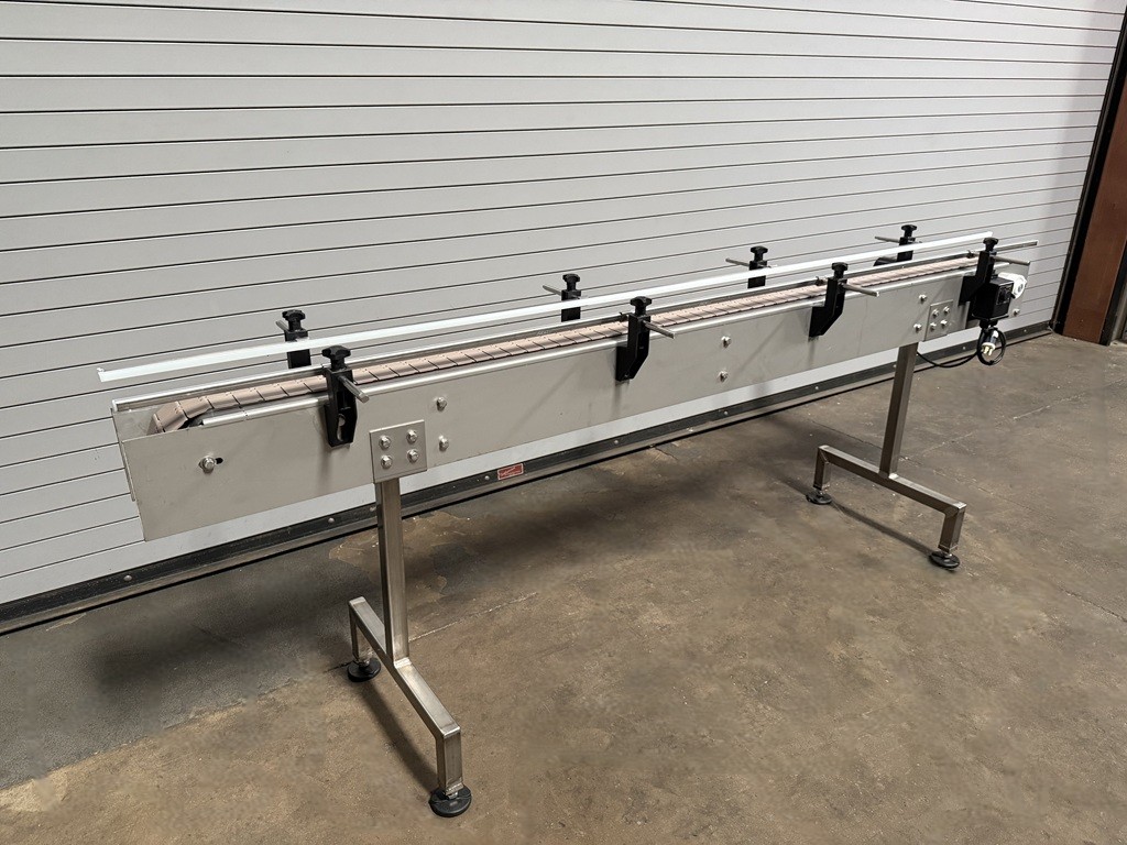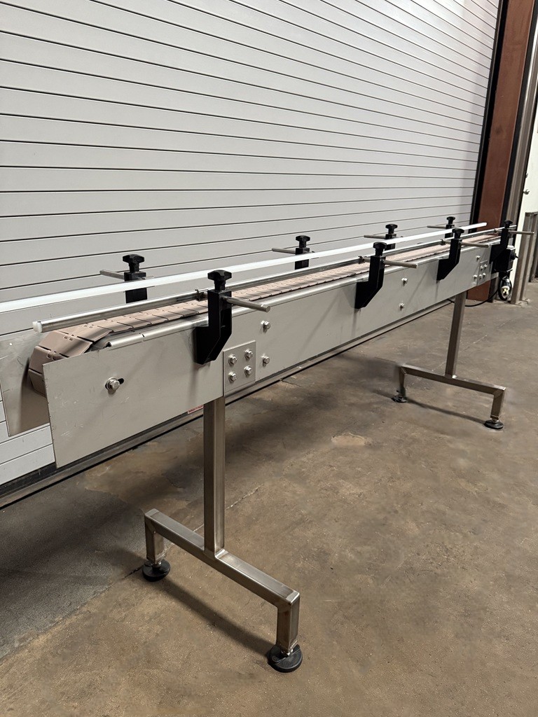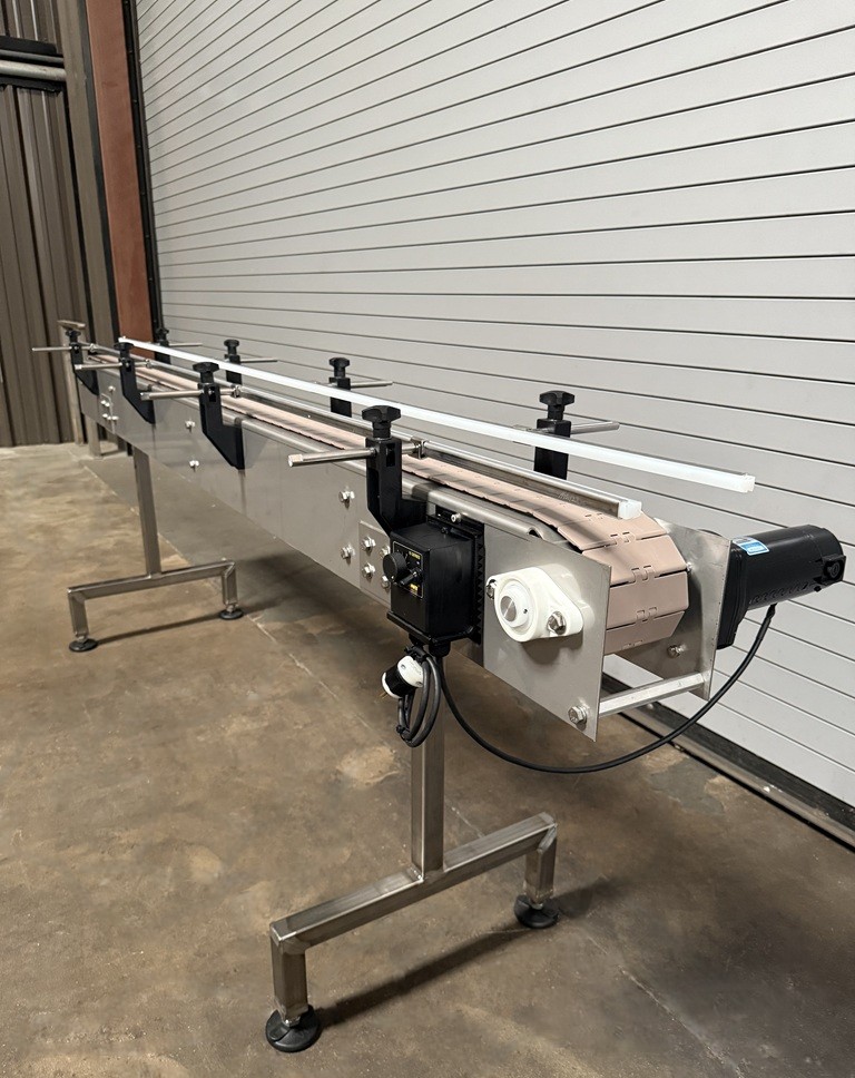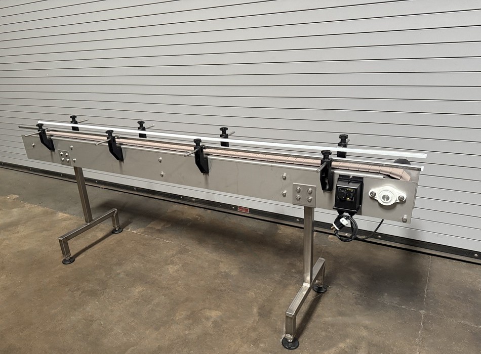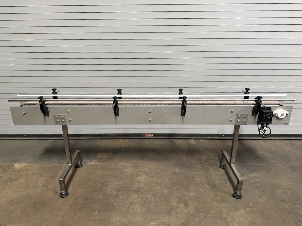 4.5″ x 8′ Long Stainless Table Top Bottle Conveyor with Speed Controls, Stainless Frame Construction, 4.5” Wide Plastic Belt, 32” Elevation (adjustable), Dart Variable Speed Controller, Stainless Side Rails, Stainless floor levelers, 1/4 HP Drive Motor, Electrical 115 Volt / 50/60 HZ. 1 Phase Please contact us to schedule an onsite inspection of this item at our Used Packaging Equipment LLC Warehouse facilities located in Caddo Mills, TX. 75135. Call us today to discuss your Conveying, Filling, Capping, Labeling, Packaging, Production and Bottling Equipment needs. This used stainless Bottling Conveyor is available for immediate shipment. You may schedule an onsite inspection of this item at our Used Packaging Equipment Warehouse facilities located in Caddo Mills, TX. 75135. Call us today!!