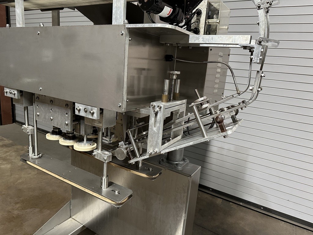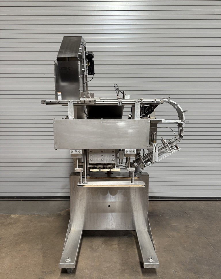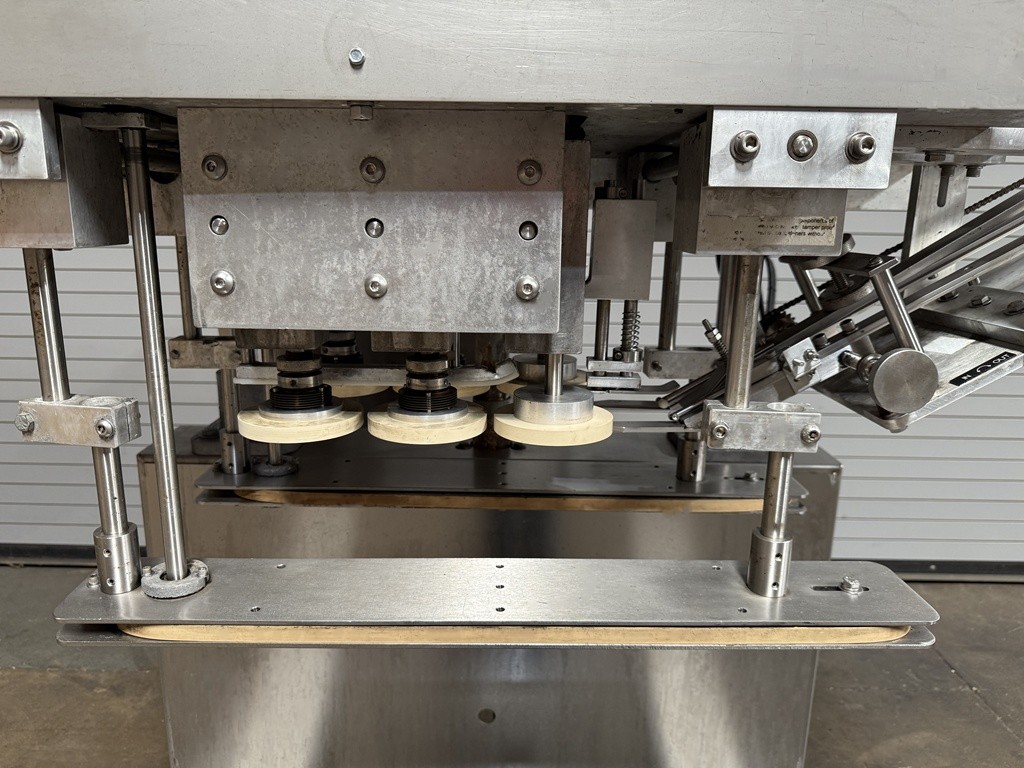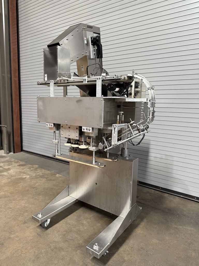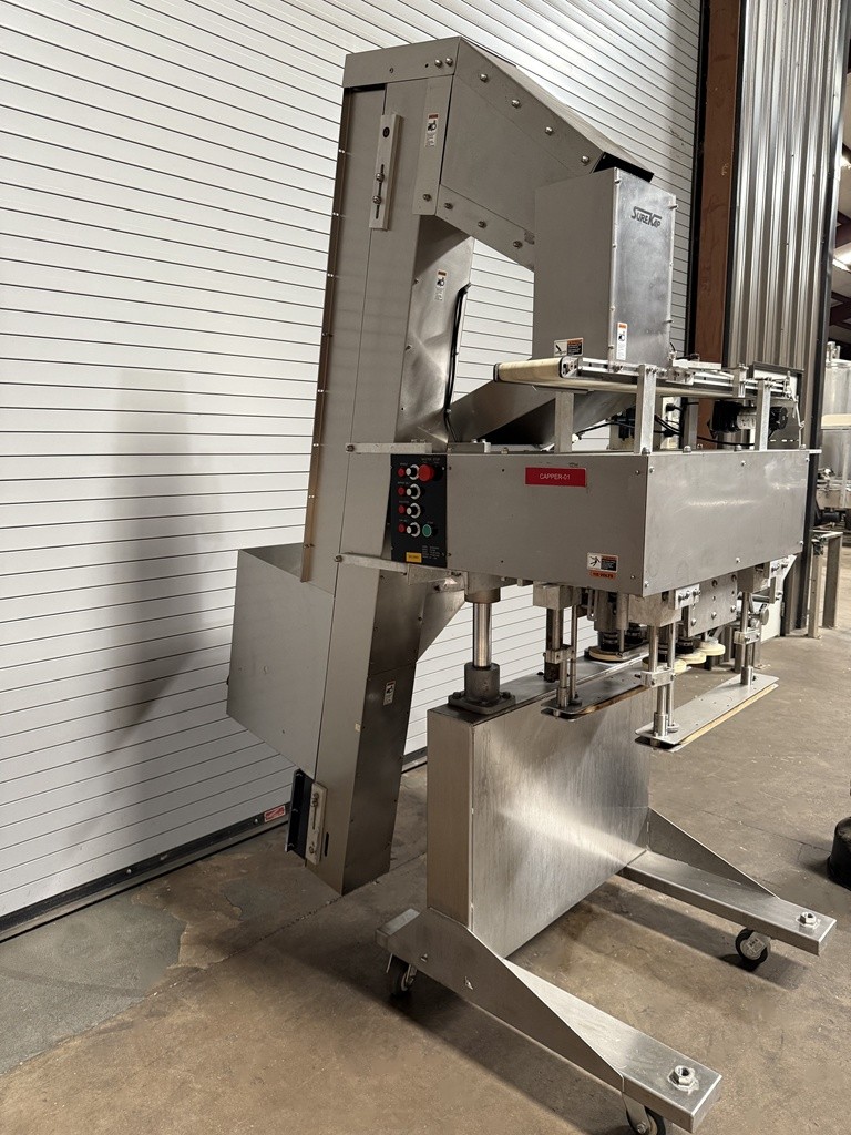 Used SureKap 6 Quill Inline Capper With Integrated Cap Feed Elevator Sorter, Model #SK6000-BF6, Serial #PA17195, Integrated Bulk Cap Feed Elevator Feeder, Stainless Frame Construction, 6 Quill Wheels, Cap Sizes up to 100mm, Adjustable Cap chute and pick off, Right to Left Direction, Container stabilizer gripper belts, Variable Speed Controls, Photo-eye cap detection, Low Cap Detection, Capper Height adjustment, Stainless Floor levelers, Casters, Air regulator Assembly, E-Stop, Operator Interface Controls, Electrical 115 Volt / 50/60 HZ. / 1 Phase, Air requirements 60-80 psi @ 1-2 scfm, Overall dimensions: 88” Long x 45” Wide x 100” high. This Surekap Automatic 6 Quill Inline Bottle Capper has been professionally removed from a major production facility. The capping machine has been function tested under power and is immediately ready to go back into production. This capping machine can be inspected at our Used Packaging Equipment LLC warehouse facilities located in Caddo Mills, TX. 75135. Please reach out to us today to discuss all of your filling, capping and packaging production needs.